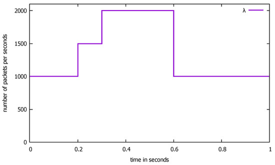We keep the same pattern of the traffic but increase its intensity. The rate of priority traffic is (), i.e., three times higher than previously in Section 3.1 in the same intervals and zero otherwise. The intensity of the non-privileged class is higher by 0.1 (), and constant.