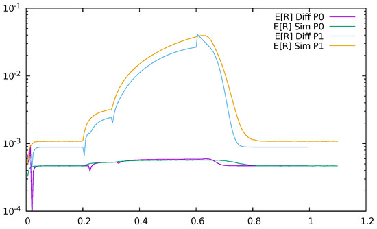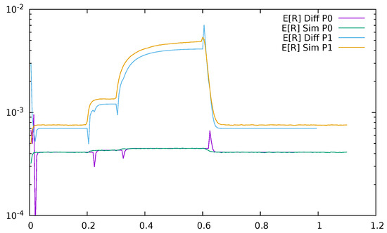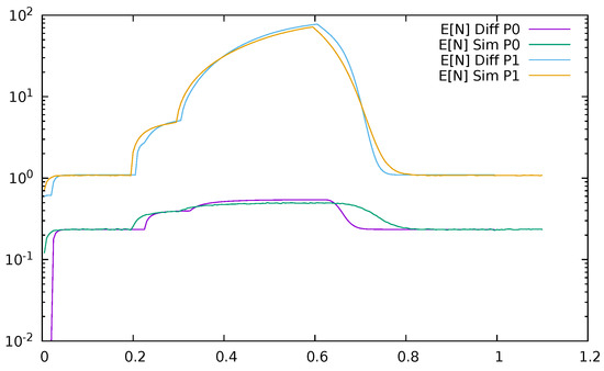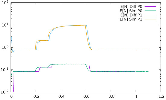Below, a few figures illustrate the numerical results. Figure 23 displays the mean queue lengths at the switch for priority (P0) and non-priority (P1) packets as a function of time, reacting to the changes in the input traffic, for . We used a logarithmic scale to show together the results for both priority and non-priority classes, which have significantly different values. The simulation and diffusion approximation results are displayed together. Figure 24 presents similar results for . Comparing both figures, we see the impact of on the queues; its increase from 0.2 to 0.5 makes the switch maximum mean queue almost ten times longer.