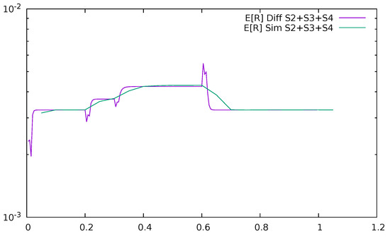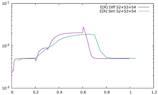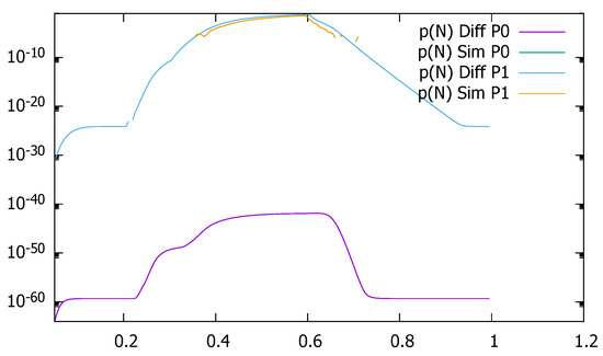 Figure 29 and Figure 30 present loss probability due to the queue saturation as a function of time, respectively, for and , obtained by diffusion approximation and simulation. It is visible that 100,000 simulation runs are not enough to obtain reliable results; they are incomplete and mostly nonexistent, while diffusion approximation has no difficulties in modeling very small probability values.