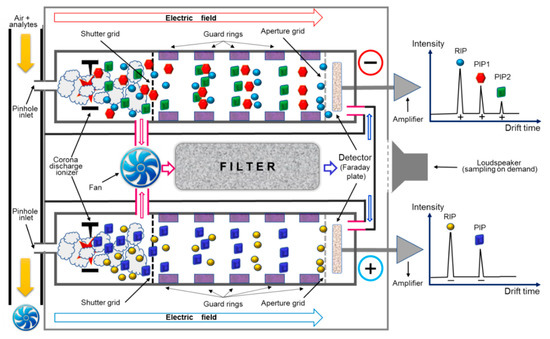 Sample air is drawn from the inlet into the sampling line using a fan having a flow rate of about 1.0 L min−1; after that, a small volume of air sample is introduced into the two ionization regions through two pinhole inlets using a reduced internal pressure produced by the vibrational movement of a diaphragm (which is a loudspeaker-type pressure pulser). Finally, the residual air sample is exhausted outside. Ionization of the sample molecules is realized by the corona discharges in the two ionization regions, and this way, both positive and negative product ions are simultaneously produced by reaction with the afferent reactant ions. Ionization regions are further connected with their corresponding ion drift (separation) regions, which are kept at ambient temperature; purified drift gas (air containing ammonia dopant, emitted from the sieve pack) is continuously circulated in the opposing flow mode with moving ions. The positive and negative ions are periodically injected into their drift regions by a gating (shutter) grid. The inner air that circulates inside the drift regions and ionization regions is continuously passed through the purifying sieve pack by using a fan as a pump. Periodical exchange of the sieve pack filter is, of course, needed when the water content increases too much and, thus, the position (drift time) of the reactant ions’ peak shifts towards longer drift times due to the increase in water clustering [6,7]. Both the positive and negative scans were performed, every several seconds, in order to record the ion mobility spectra of 20 ms each. For our experiments, the power supply interface (mains, AC 220 V/50 Hz) was also housing the computer interface. The instrument was operated via a PC computer, using the proprietary IMS control software TrimScan2, ver. 0.4.0 (Smiths Detection Ltd.). This way, data (as negative ion mobility spectra) were saved on the hard disc as IMS spectra, which were subsequently analyzed using the aforementioned proprietary software, TrimScan2. A schematic of the lightweight chemical detector ToF IMS model LCD-3.2E, including the typical resulting responses (ion mobility spectra), is presented in Figure 1.