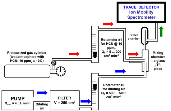 The concentration of HCN vapors in the final standard atmosphere, after mixing the two gas flows, is easily calculated using the relationship CHCN = (C0·Q1)/(Q1 + Q2), where C0 = 10 ppmv is the concentration of HCN vapors in the gas cylinder; Q1 is the flowrate of the gas flow delivered by gas cylinder, and Q2 is the flowrate of diluting air.