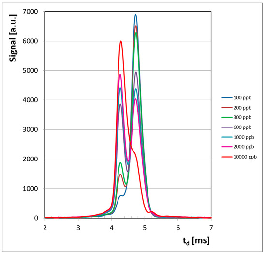 Reduced ion mobility for the single ion peak generated in the negative mode was found to be K0 = 2.38 cm2 V−1 s−1, a value that is in good accordance with other results indicated in the literature: 2.38 cm2 V−1 s−1 [19], 2.46 cm2 V−1 s−1 [20], or 2.47 cm2 V−1 s−1 [18]. Figures of merit given in the literature and those found by us are summarized in Table 5, where LoD is the limit of detection and LoQ the limit of quantification, respectively.