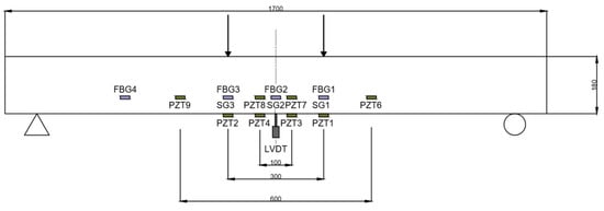 For the EMI tests, eight PZT patches (PZT1 to PZT2 and PZT5 to PZT9 according to Figure 1) were bonded in different locations of the specimen to be analyzed. Inner sensors were directly bonded to the FRP laminate. PZT1 and PZT2 are sensors of type P-876.A12 (61 mm × 35 mm× 0.5 mm), while sensors PZT3 to PZT9 are sensors of type P-876.SP1 (16 mm × 13 mm × 0.5 mm). All of them are provided by Piceramic [].