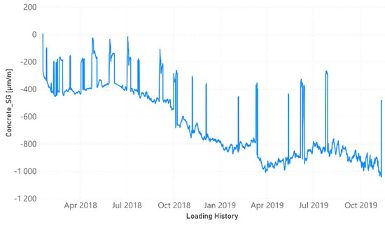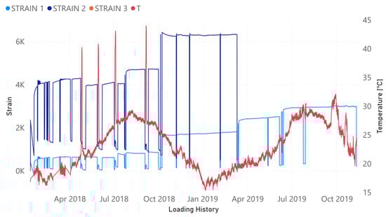 Figure 3 presents the evolution of the strain (sensors FBG1, FBG2, and FBG3) and the temperature (FBG4) for the four optical sensors along the loading history. In the same way, the evolution of the vertical midspan deflection as well as the compressive strain in the upper concrete surface are shown in Figure 4 and Figure 5, respectively. From the very beginning, FBG3 sensor did not work correctly and, therefore, the orange line in Figure 3 is only slightly visible initially. Strain values are shown in Figure 3 once temperature compensation has been performed.