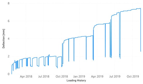 Although Figure 3, Figure 4 and Figure 5 show the results until November 2019, the last impedance test was performed at the end of July 2019 (Table 1). The load increments along the time are perfectly reflected by the increment experienced by the strains. However, because of the short duration of the sustained load tests, the creep behavior was little developed. FBG2 sensor, located at the midspan of the beam, did not already work correctly when yielding initiated and its value is only shown until that moment. A remanent strain remained at the midspan of the NSM-FRP laminate after each unloading. One interesting aspect to remark is that this strain is lower whenever the level of sustained load previously reached is higher.