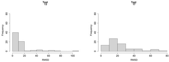 Initially, before performing the statistical analysis, means and standard deviations were calculated for the variable RMSD. As a sample, Figure 6 shows the RMSD histograms for tests 13 and 17 according to Table 1. Test 2 was taken as the reference stage to compute RMSD values since previous to this stage the specimen was moved which required the disconnection and subsequent connection of the measurement equipment. From Test 2, the beam remained permanently installed in the same location and the equipments were not disconnected again. It is clear that RMSD was not normally distributed for tests 13 and 17. Although not shown her by simplicity, the conclusion would be the same for the other tests.