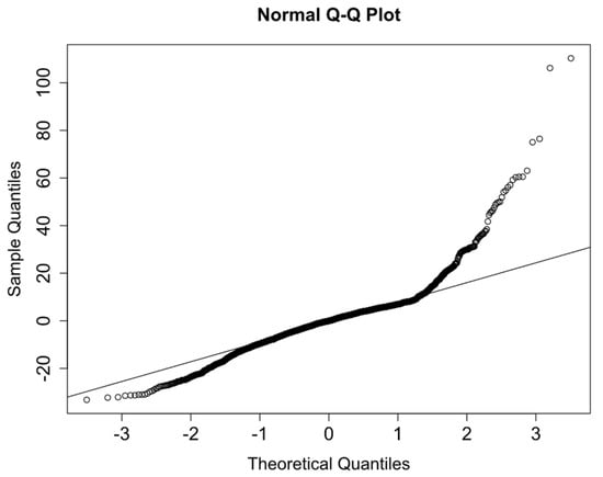 Non-normality is also confirmed by the quantile-quantile plot (Q-Q plot) (Figure 7). The strong deviation from the provided line is a clear symptom of non-normality of the residuals.