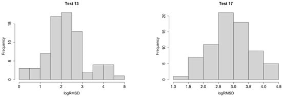 Because of the non-normality of the residuals, we will work with a log-transform of the response to check if this condition is improved. Kolmogorov-Smirnov test will allow to know if the data have a significant departure from log-normality. Table 2 shows the p-values for all tests considering all sensors. The interpretation of p-value is similar to the Shapiro-Wilk test. Results demonstrate that, except for test 32, our data follow a log-normal distribution and, therefore, the LMM analysis will be made using logRMSD. As a sample and for comparison with Figure 6, Figure 8 shows the logRMSD histograms for tests 13 and 17.