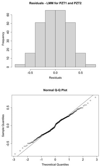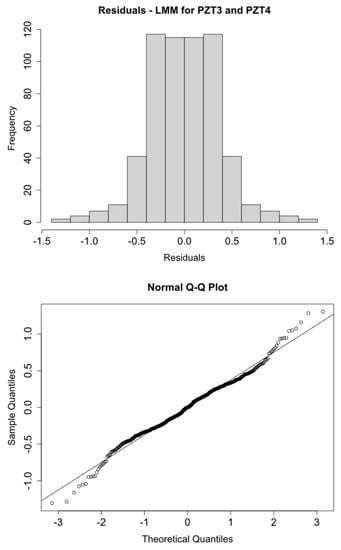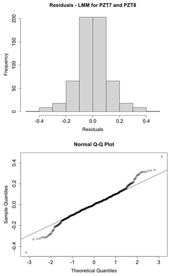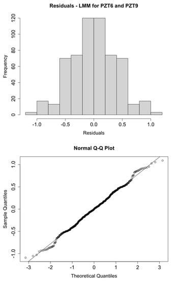 Normal distribution of the residuals (difference between the observed values and the model-estimated values) was also verified by the Shapiro–Wilk test when all results from the experimental tests were combined. A p-value (probability of our data following a normal distribution given the dataset) lower than 2 × 10−16 was computed, which indicates a significant departure from the normal distribution in the residuals of the model.