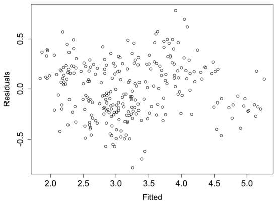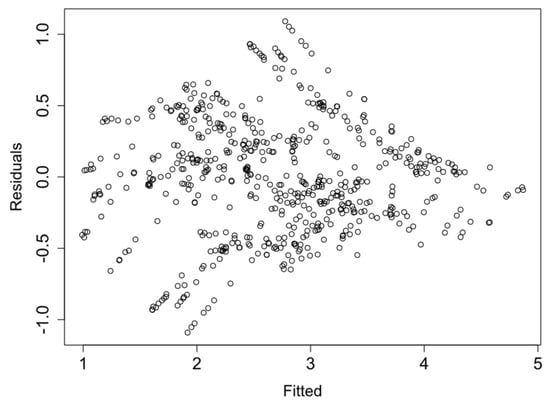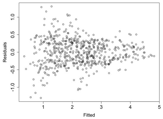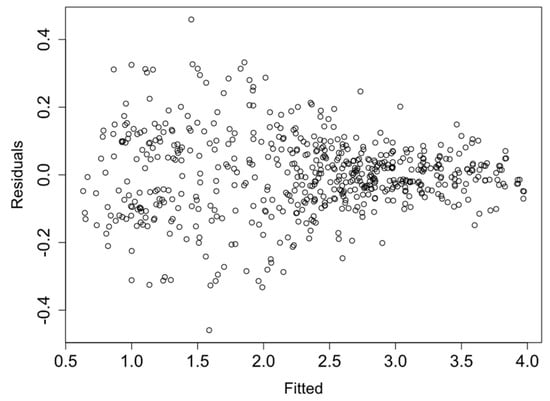 Finally, the linearity and homocedasticity of the logRMSD function are checked such as required by the model. Figure 13, Figure 14, Figure 15 and Figure 16 show the plots of the fitted values against the residuals of the model for each group of sensors. As the variance of the residuals is not dependent on the fitted value, the homocedasticity condition is not violated. Furthermore, none obvious pattern can be inferred in the residuals, and therefore the linearity assumption is also verified.