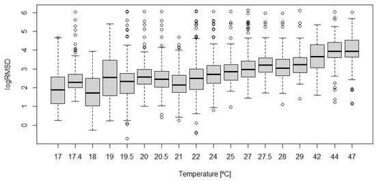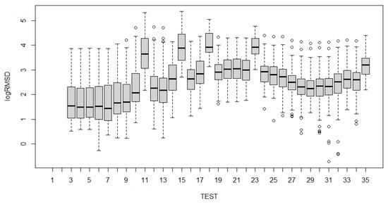 Boxplots shown in Figure 17, Figure 18, Figure 19, Figure 20 and Figure 21 show clearly how the increase of temperature (tests 11, 15, 18, and 23) affects in a higher proportion to RMSD than the mechanical variations introduced by the applied loads. This different sensitivity can be used to discriminate those variations due to the temperature from those due to mechanical damage. This conclusion is extensible to all groups of sensors. Boxplot of RMSD for the different temperatures reached along the test campaign has been also computed (Figure 22). It shows clearly the influence of the temperature on RMSD index and the sensitivity for each temperature value.