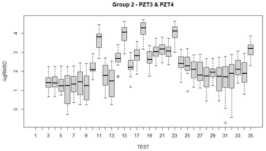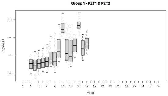 To analyze the evolution of the variations of the fixed effects experienced by the specimen across the 35 experimental tests (Table 1) with the fitted LMMs, several alternatives are possible. Such examination can be carried out using test statistics and p-values. Boxplots have been constructed for all sensors and for each of the groups of sensors (Figure 17, Figure 18, Figure 19, Figure 20 and Figure 21). For group 1, only results until test 17 are shown since this group includes PZT2 sensor which came unglued partially during this test. Table 4 shows the p-values computed from the analysis of deviance for the LMM. A low p-value, such as observed in Table 4, means that the variations experienced by the specimen, both due to mechanical damage and temperature, affect significantly to the RMSD index. This confirms the suitability of this metric to assess the structural condition of the beam. In a further study, the frequency was also included as a fixed effect in the model and p-value was computed such as shown in the last row of Table 4. In this case, it is clear that the frequency does not have effects on RMSD coefficient.