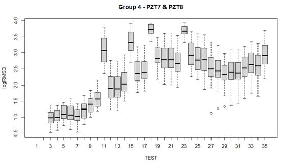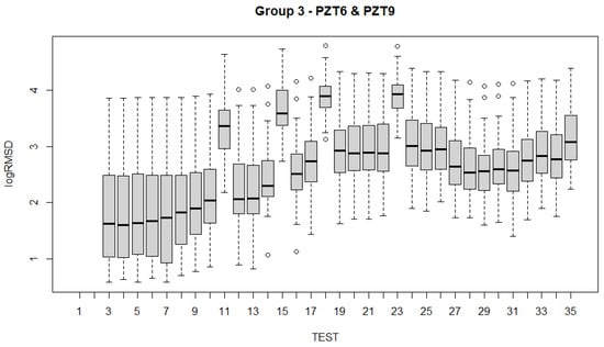 Now, if we compare the evolution of boxplots in Figure 17, Figure 18, Figure 19, Figure 20 and Figure 21 with the evolution of temperature of the specimen (red line in Figure 3), we observe clearly that the evolution is very similar which demonstrates the high sensitivity of the impedance to the temperature and can explain some of the phenomena occurring in the specimen. Any decrease of temperature is reflected by a decrease of log(RMSD), while any increase of temperature involves an increase of log(RMSD). This is clearly identified for tests 26 to 30 under 13.7 kN where an initial decrease of temperature is continued with a subsequent increase of temperature (Figure 3). The keypoint is how to filter this from the variations due to mechanical damage. For it, the identification of the results of Figure 18, Figure 19, Figure 20 and Figure 21 with Figure 3 and Figure 22 and the data contained in Table 1 helps to filter the observations. For instance, the results show that under sustained loads, except in case of a remarkable mechanical change, little variations are identified in log(RMSD) and those are probably due more to environmental temperature variations than to damage. In this sense, if we observe Figure 21 for tests 3 to 10 in comparison with Figure 18, Figure 19 and Figure 20, it is clear that some mechanical damage occurred near the sensors belonging to group 4. Additionally, some cracks developed around the external sensors during test 10. By using the same philosophy, it is clear that for the last test a severe damage occurred near all sensors with special focus on those sensors closer to the midspan (groups 2 and 3).