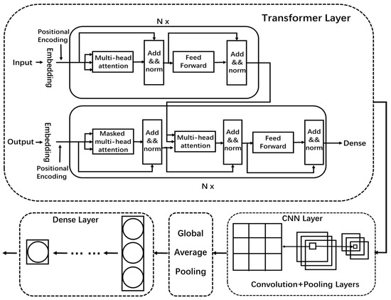 The decoder conversion result, corresponding to the encoder, was also converted into three parts: query, key, and value as input. After positional encoding, masked multi-head attention, feed-forward, and the output structure from the encoder were jointly input to multi-head attention and then passed through feed-forward, which first output the space, and then finally output the probability distribution through the dense layer. For each block, the transformer added the normalization layer, which contained the residual structure and layer normalization to standardize the optimization space and accelerate convergence.