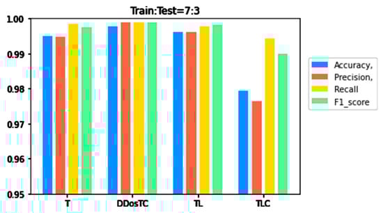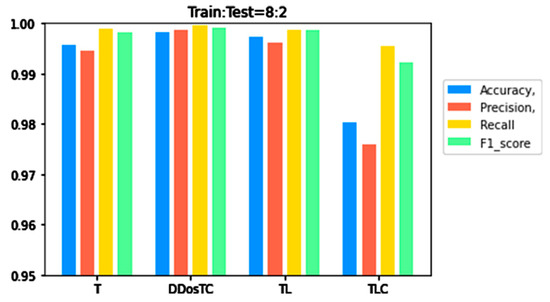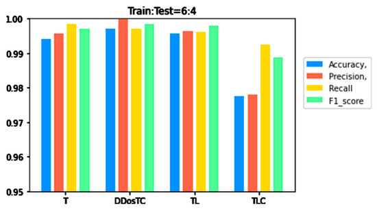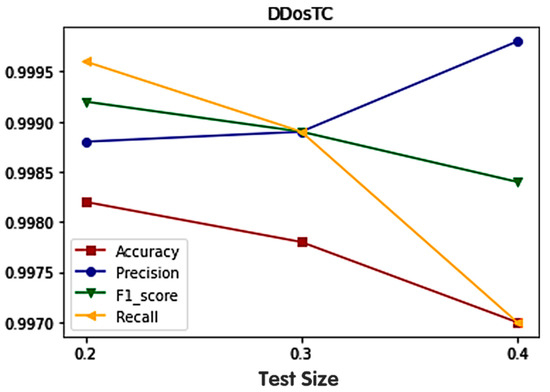 From Figure 8, Figure 9 and Figure 10 and Table 1, we can see that the accuracy of DDosTC with a training set/test set ratio of 8:2 was 0.9982; with a training set/test set ratio of 7:3 was 0.9978; and with a training set/test set ratio of 6:4 was 0.9970, which was the most successful when compared with the other models.