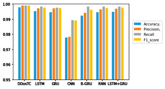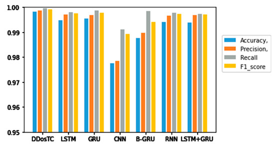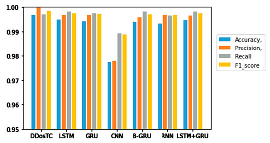 This section introduces the results of experiments with DDosTC and compares our proposed method’s performance with that of the detection methods that have appeared in recent years—recurrent neural network (RNN), gated recurrent unit (GRU), convolutional neural network (CNN), long short-term memory (LSTM), hybrid deep learning (LSTM + GRU), and bidirectional long short-term memory (bidirectional GRU)—in terms of accuracy, recall rate, F1 score, AUC, and other aspects of our proposed model.