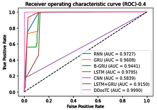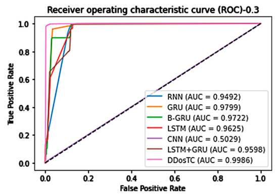 In general, our model, DDosTC, was superior to the other tested algorithm models. To further verify that our model was more successful than other models, we tested the AUC of the model; we still divided the dataset into three parts, and the results are shown in Figure 12, Figure 13 and Figure 14.