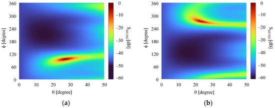 As a way of illustrating the performance improvement obtained by using the formulation discussed in this paper, the MUSIC algorithm was run considering that the four antennas in the array of Figure 6 are isotropic radiators, i.e., all antenna patterns are equal and uniform [30]. Note that with this modification, the polarization of the incident waves can no longer be determined. The scattering matrices of the array and receiving circuit were the same as in the calculations for the microstrip antenna array. Figure 18 shows the plots of the function for this new array, considering the normalized voltages of Cases 1 and 5 in Table 5. As seen, the MUSIC algorithm was not able to determine the correct DoA for both cases, and the plot of Case 1 exhibits ambiguity as well. Furthermore, the difference between the maximum and minimum values of the function is not greater than 12 dB, making it difficult to find the peaks.