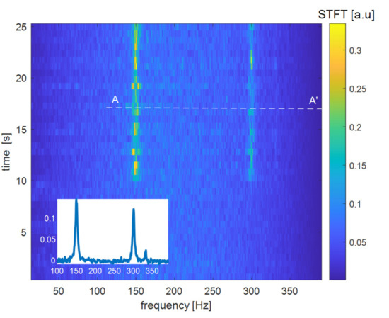 Spectrogram of the ϕ-OTDR signal acquired over the vibrating position. The inset shows the data corresponding to the white dashed line A-A’. STFT stands for short-time Fourier transform.