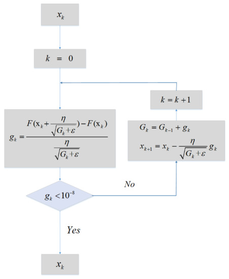 Since we proposed a KF-based AdaGrad numerical cost function , the AdaGrad algorithm needs to be discretized. The Algorithm flowchart is shown in Figure 1.