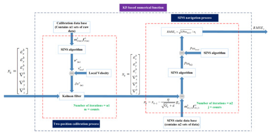 As is shown in Figure 2, the entire KF-based numerical function can be divided into two major processes: (1) two-position calibration process and (2) SINS navigation process. A detailed explanation of these two processes is as follows: