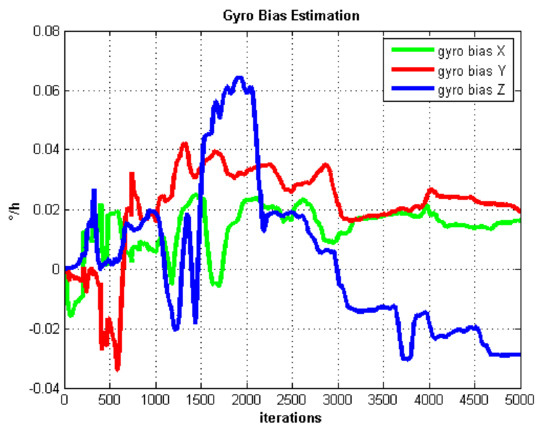 In [7], Han et al. proposed a method for bias calibration using a single-axis turning table. The disadvantage of this method is that the calibration accuracy depends highly on the turntable accuracy. In current SINS implementations, in order to overcome the non-observability of the biases of the IMU biases, an analytic calibration of IMU biases with two-position is utilized widely [8]. Many works have been done in the field of IMU calibration. In [9], an eight-position self-calibration method was proposed. Emel’yantsev et al. calibrated in-rum drifts of SINS with uniaxial modulation rotation of measurement unit. Since the low end IMU model is nonlinear, some researchers use an adaptive Kalman filter to estimate IMU biases [10,11,12,13,14,15]. Wang et al. utilized a new online calibration method for integrated navigation systems [16]. In [17], a rotation test was utilized to enhance the observability of KF in order to calibrate the IMU biases. However, KF is an unbiased estimation method based on the assumption of GWN while IMU sensors noise is irregular [18,19,20]. In [21], an autocovariance least-squares (ALS) technique was proposed to estimate the process noise of IMU. In [22], particle swarm method was utilized in gyro drift estimation. For high-dimensional systems especially for those with weak observability. The adaptive estimation of IMU biases tend to diverge. In order to solve the problem, further researches are needed on this issue.