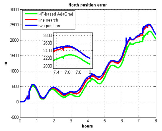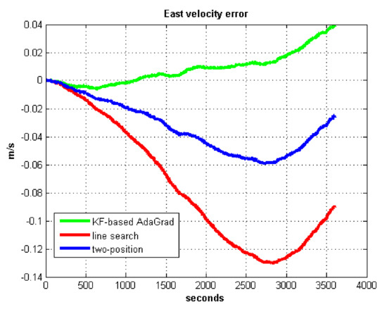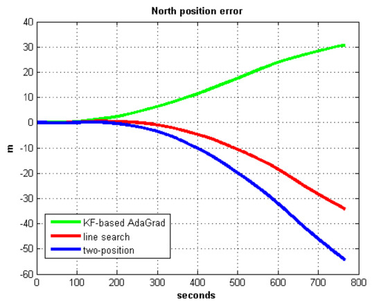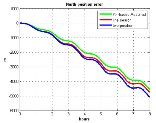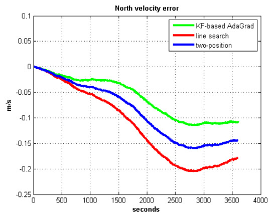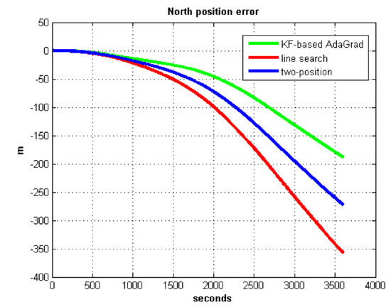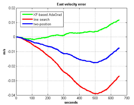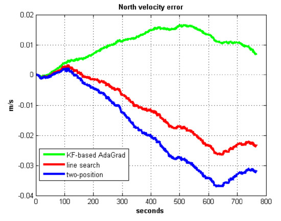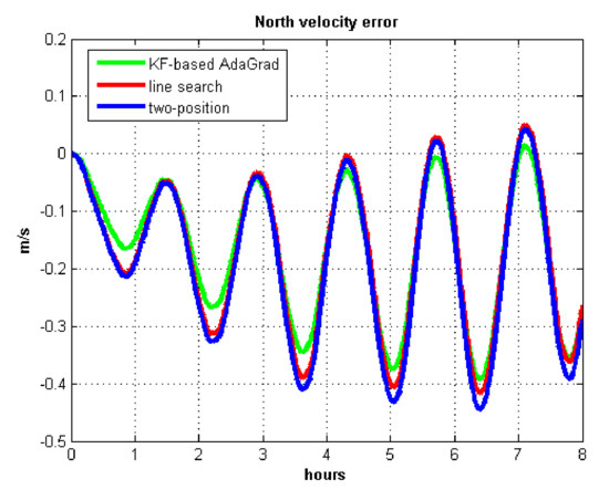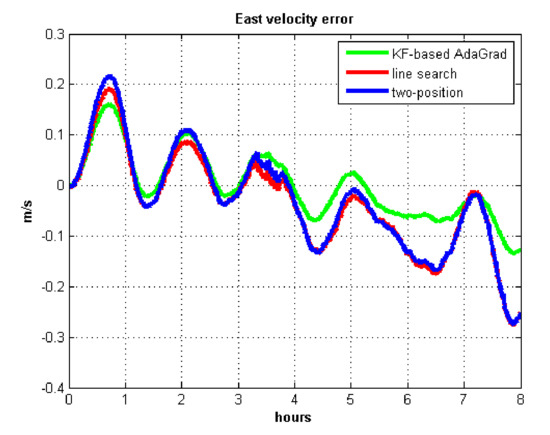 The velocity and position errors show that KF-based AdaGrad calibration method is more accurate than the line search and the two-position calibration method. The 8 h test shows the peak value of each north and east position errors. AdaGrad has higher accuracy in static test.