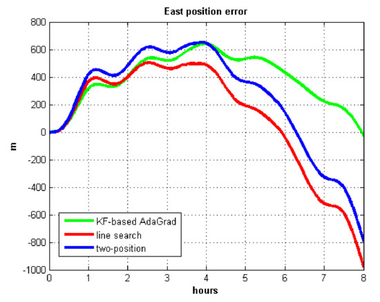 In field test 2, Figure 21 and Figure 22 show that the east and north velocity error utilizing KF-based AdaGrad is the smallest among the three methods. The line search method is more accurate than the two-position method. The position errors are shown in Figure 23 and Figure 24, the east and north position error which utilized KF-based AdaGrad are obviously smaller than the other two methods. The position error of which utilized line search is smaller than the error of which utilized two-position method. The results of RMS and maximum values of velocity and position error are shown in Table 7 and Table 8.