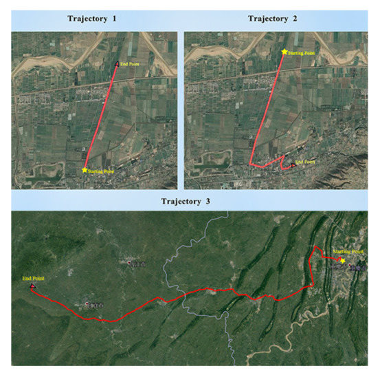 Three field tests were carried out and the corresponding trajectories are shown in Figure 16. Table 4 shows the field test arrangements. During the maneuvering process of the vehicle, we utilize the SINS/GPS integrated algorithm to provide precise velocity and position information as the velocity and position reference. In order to compare the two-position algorithm, line search and AdaGrad, we utilize the same trajectories to compare the three algorithms.