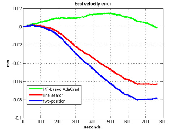 In field test 1, Figure 17 and Figure 18 shows that the east and north velocity errors of which the utilized KF-based AdaGrad are the smallest among the three methods. The two-position method is more accurate than the line search method. The position error is similar to the velocity error. Figure 19 and Figure 20 show that the east and north position error which utilized the two-position method smaller than the error of which utilized line search. The method utilized KF-based AdaGrad has the smallest position error.