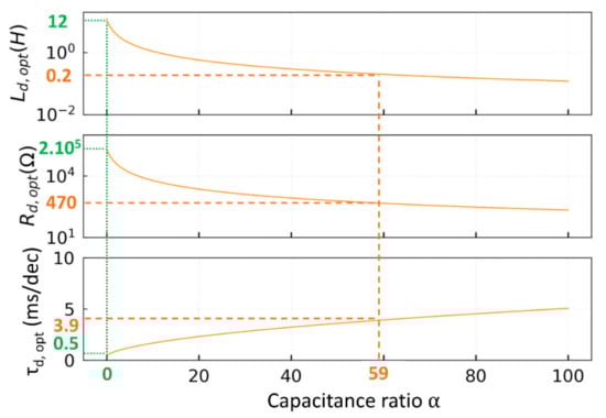 Evolution of the optimum damping inductance, resistance and 1-decade decay time as a function of α. The minimum decay time of 0.5 ms/dec is obtained for a capacitance ratio of 0 (green dotted line). In our case, for a damping inductance of 0.2 H, the capacitance ratio is 59, which leads to an optimal damping resistance of 470 and a decay time of 3.9 ms/dec as shown by the orange dotted line.