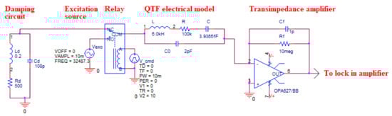Schematic of the electronics circuit on OrCAD PSPICE including the damping circuit, the excitation source, the switching relay, the QTF and the transimpedance amplifier [7].
