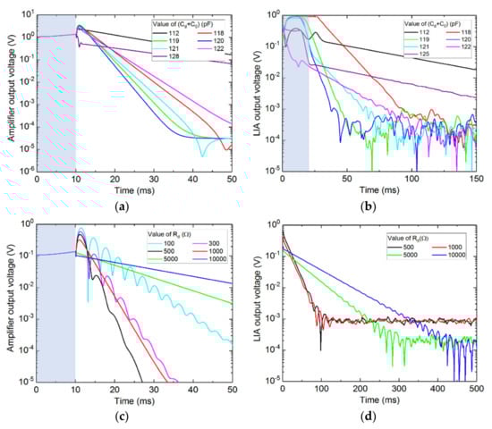 The schematic of the simulated circuit is shown in Figure 3. It includes the damping circuit, a sinewave voltage source, an electro-mechanical relay, the QTF equivalent model and a transimpedance amplifier (TA). The effect of the damping circuit onto the QTF is well described by displaying the QTF energy (Li2(t) + Cu2(t)) or the output voltage of the amplifier. The latter is more relevant because it is the one practically measurable. Experimentally, the measurements are performed using a lock-in amplifier (LIA) (Zurich Instruments MFLI, Zurich, Switzerland) located after the transimpedance amplifier. The time constant of the LIA was set around 1 ms in order to measure the beat signal [7].