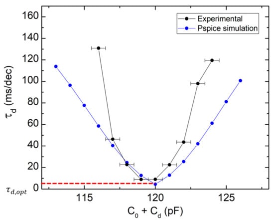 As we focus on the damping effect, it is more convenient to represent the same results in terms of decay time (Figure 5). The 1-decade decay time τd is the inverse of the slope on a logarithmic scale, and represents the time spent for a 1-decade signal drop. It follows a parabolic behavior as a function of the damping capacitance with an optimum value τd,opt corresponding to the minimum value of the parabola. The position of the parabola vertex is similar for the experiment and the simulation. However, the experiment is more sensitive (i.e., with a higher curvature) to the effective damping capacitance than the simulation. It is certainly due to the error in the measurement of C0. The measured value is probably larger than the true value due to the parasitic capacitances of the characterization circuit.