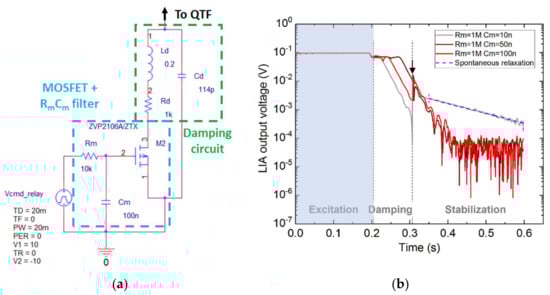 (a) PSPICE schematic of the damping circuit and the MOSFET inserted in the RL branch. The MOSFET gate is driven by a voltage source connected to a low pass RC filter. (b) Observing the QTF response to damping for different values of the filter capacitance Cm. The damping is enabled just after the end of the excitation by applying a negative voltage to the MOSFET gate. The arrows indicate the moment the MOSFET was turned off, that is 100 ms after the onset of the damping.