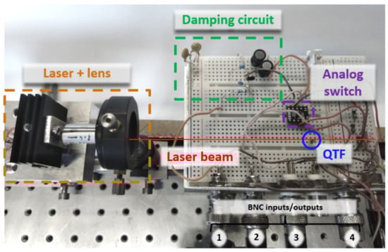 Picture of the setup-based on a standard “bare” on-beam Quartz-Enhanced PhotoAcoustic Spectroscopy (QEPAS) setup, plus the damping circuit. The QEPAS system is composed of a laser, a lens (f = 4 mm) and a QTF. The QTF is plugged into a test breadboard along with the other electrical components. The analog switch (controlled by BNC3) allows to switch between the QTF electrical excitation (BNC4) and the damping circuit. The damping circuit is the parallel RLC circuit resonantly matched to the QTF central frequency (see previous sections) and is disabled through applying a voltage on the MOSFET gate (BNC1). The output of the QTF (BNC2) is connected to a transimpedance amplifier and a lock-in amplifier (not represented here).