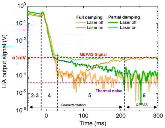 A typical RT-QEPAS cycle can be observed in Figure 9. It consists of 6 steps: the steps 1 to 5 correspond to the QTF characterization, and the step 6 is the QEPAS measurement. The cycle is presented for four cases: with full damping (orange) or partial damping (green), and with laser on (thin line) or laser off (thick line). After the electrical excitation (step (1), not represented in the figure), the QTF undergoes a spontaneous relaxation (step (2)) with a typical slope of 10 ms/dec and an oscillation frequency of (obtained with the in-phase signal of the LIA [15], not represented here), which are measured to calculate the QTF parameters (step (3)). The details of the method have been laid in [7]. Right after, the damping circuit is enabled to quickly discharge the QTF (step (4)). It takes about 50 ms to reach the thermal noise (purple dotted line). After the damping, the laser modulation frequency is adjusted to the value of f0 (measured at step (3)). With the laser off, the signal stays at the noise floor, while with the laser on, the QTF signal increases due to photoacoustic generation. About 200 ms are required for the QTF to charge (step (5)). Ultimately, the QEPAS signal (red dashed line) can be measured in order to deduce the gas concentration. The QEPAS signal can also be normalized by the quality factor, since the QEPAS signal is known to be proportional to Q [17].