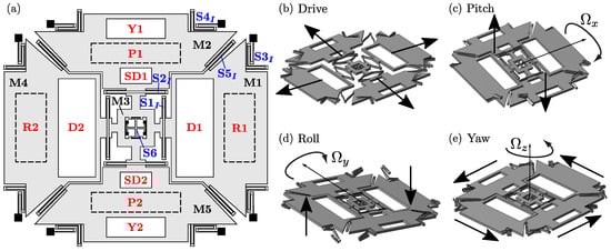 Reference layout of a triaxial beating heart MEMS gyroscope (a) and associated modal shapes: drive (b), sense pitch (c), sense roll (d), and sense yaw (e) modes. Redrawn from [].