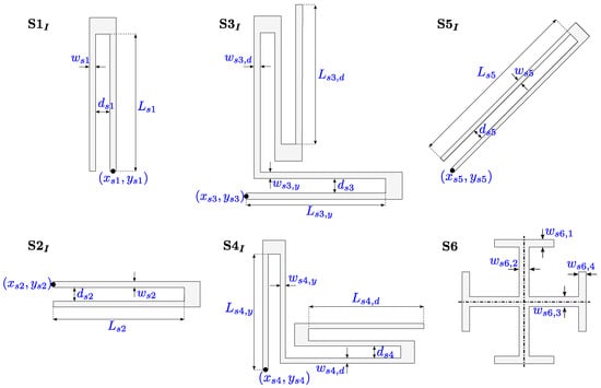 Figure 3 shows the 33 design variables related to the springs: they are described by the coordinates of an initial point and by parameters related to the geometry of the composing beams (such as width w, length L, and distance between parallel beams d). In particular, springs of similar type (e.g., U-shaped springs with different orientation , , or serpentine springs with equivalent folds , ) share the same parametrization and involve equivalent design parameters.