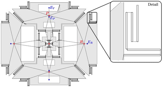 Once the geometry of the structure has been generated, the MEMS behavior is simulated using the schematization shown in Figure 5. The proof masses are schematized as rigid bodies whose inertial properties are condensed at their centers of gravity (red dots), while springs are discretized by Timoshenko beam finite elements (detail of Figure 5). Rigid connections (dashed lines) are imposed between the Timoshenko beams composing each spring, as well as between the springs and the masses they are attached to. This is done using Multi-Point Constraints (MPC, []), which impose a set of explicit kinematic constraints between the degrees of freedom of interest. One additional node is also considered at the center of each sense electrode (blue dots) and rigidly connected to the center of gravity of the corresponding proof mass. This allows one to properly compute the mechanical response of the sensor to the external input and also to account for electrostatic softening effects.