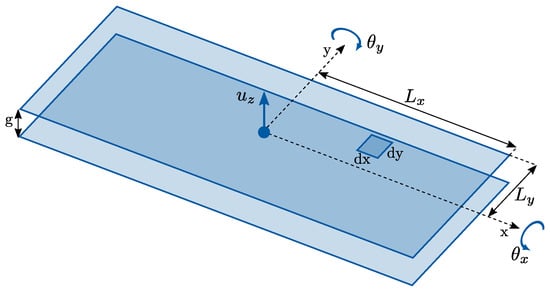 In order to detect the out-of-plane motion of proof masses (e.g., due to pitch and roll angular rates), rectangular detection electrodes are usually placed beneath the proof masses, resulting in out-of-plane variable-gap capacitors as shown in Figure 6. Here, the top plate (free to move) is represented by the proof mass bottom surface, while the bottom plate (fixed) is represented by the electrode on the substrate. The overall capacitance is a function of the vertical displacement of the top plate and of its out-of-plane rotations and . In particular, the infinitesimal capacitance in a generic position is