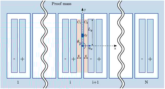 The in-plane motion of the proof masses is detected by a series of differential in-plane electrodes as shown in Figure 7. The represented configuration allows one to detect displacements along the x direction, and differential sensing is obtained through two sets of capacitors that are oppositely influenced by proof mass displacements, namely between the proof mass and the fixed plates (“+”) and between the proof mass and the fixed plates (“−”).