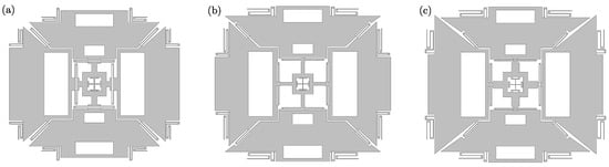 The 10 additional design variables related to the masses are shown in Figure 4: the roll and pitch masses and are initially described as trapezoidal shapes characterized by the coordinates of four significant points. Such trapezoids also include local modifications to ensure sufficient room for electrode and feasible connections with spring . The parametrization of the central cross-shaped mass includes only the two dimensions indicated by , but its geometry depends also on the position of the springs and , to which it is kept connected.