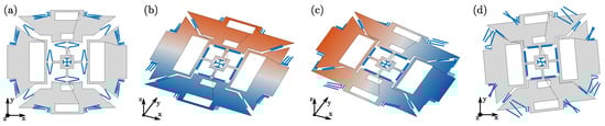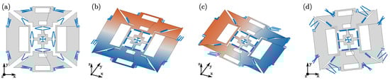 Modal shapes of the layout optimized by solving (P2) (Figure 8c): drive (a), pitch (b), roll (c), and yaw (d).