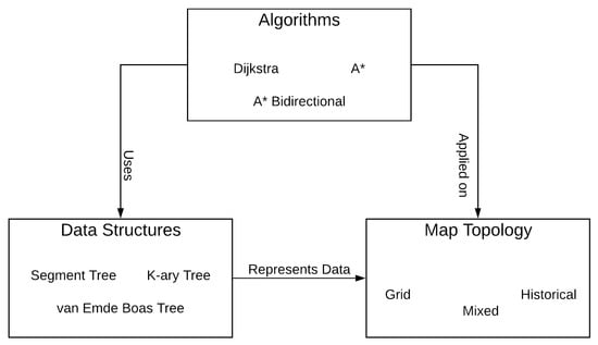 In Figure 1 are represented the 3 pillars and their relations. Considering the pillars’ classification in [], for different map topologies (e.g., grid, historical, mixed) can be used different range query data structures (e.g., Segment Tree, K-ary Interval Tree, K-ary Entry Point Tree, van Emde Boas Tree) to store the traffic information on road segments on the map. On top of this, different route generation algorithms (e.g., A*, A* Bidirectional, Dijkstra) can be used to generate vehicle routes based on map data and traffic information. Moreover, there can be scenarios where it is more efficient to apply a specific route planning algorithm over a specific map topology [].