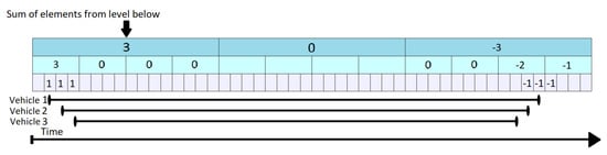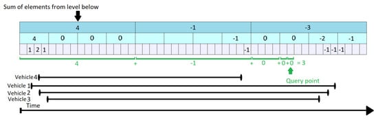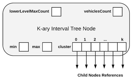 Another data model that has similar structure with ours is van Emde Boas Tree [,,]. A van Emde Boas Tree node has the number of children exactly equal with the square root of maximum number of elements that can be stored in the entire tree. Together with the above discussed data structures, it is one of the range query data structures that has potential to be used to answer traffic related queries. Table 2 shows asymptotic time and space complexities for all mentioned data structures. We denote by n the number of nodes in the tree. Thee root corresponds to the entire time interval to be covered, while each node covers recursively sub-intervals of the parent node’s interval, with each second represented by a leaf in the tree. In this way n corresponds asymptotically to the number of seconds in the time interval that is covered by the root of the tree (e.g., seconds in a day).