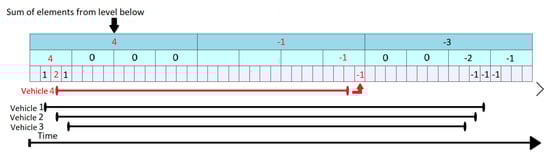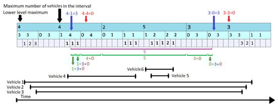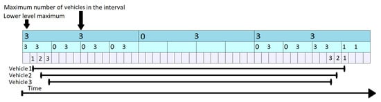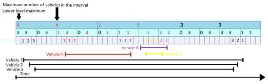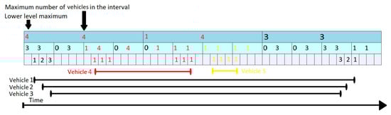 Assuming the requirement to query maximum number of vehicles during time interval given by , on the segment represented in Figure 6. The queried time interval can be seen in Figure 6 as the area underlined with purple. The green lines in Figure 6 cover the positions iterated by the query, with one green line for each position.