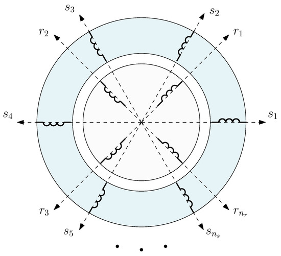 For using the conductor as the most basic unit, a reference frame is established by considering that the circular air gap is evenly divided into N segments, and that each of them is filled with an elementary conductor, located in the air gap zone, with an electrical axis attached to it (see Figure 5). In [25], two layers of conductors have been considered instead, one placed on the inner stator surface and the other one placed on the outer rotor surface. The maximum spatial harmonic of the winding that can be represented in this reference frame is , and, therefore, a high value of N is selected ( in [29]).