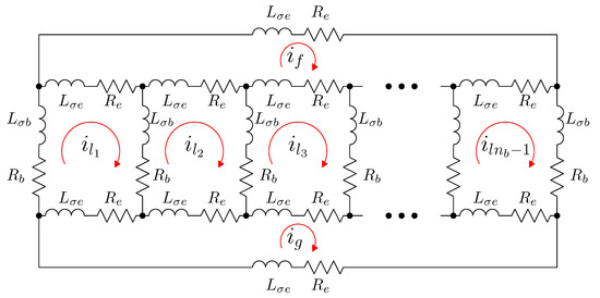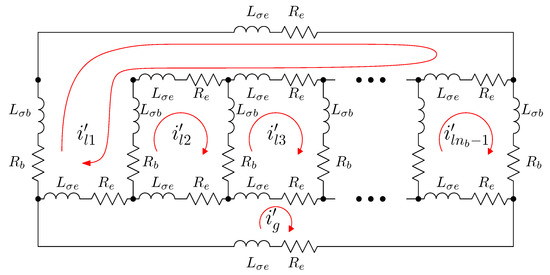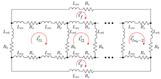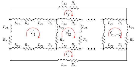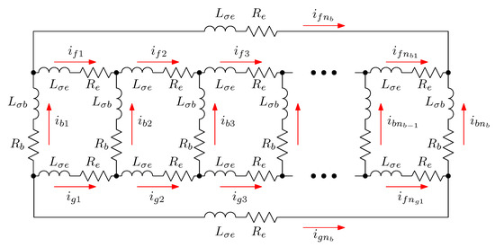 Following the method of tensor analysis proposed by Kron in [26], the rotor cage network is modelled first by considering bar and end ring currents as independent variables, shown in Figure 3. The actual rotor cage parameters will be obtained from this primitive network by using a transformation matrix that represents the connections between those elements, and applying (5).