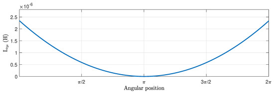 whose component , , is the mutual partial inductance [25] between the conductors placed at positions and , with . In case of an IM with uniform air gap length, as represented in Figure 5, and considering that the air gap is small compared to its radius, depends only on the angular separation between conductors i and j, and is given by [42]